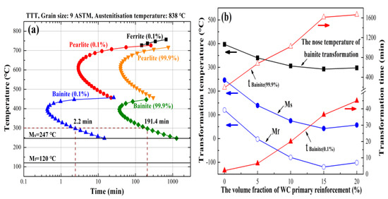 The austenite isothermal transformation kinetic of the composites: (a) time–temperature transformation (TTT) diagram of the bainite steel; (b) bainite and martensite transformation information of the composite with different volume fractions of WC primary reinforcement.