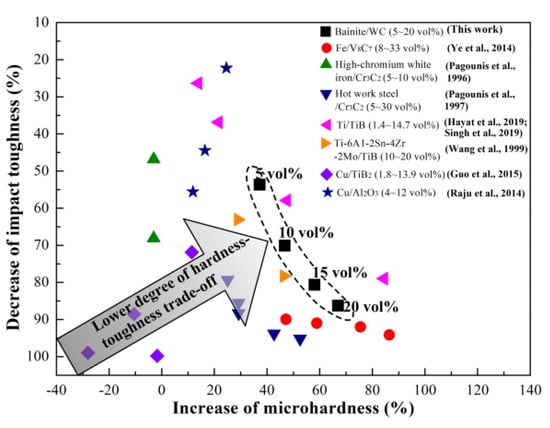 Hardness-toughness trade-off caused by the increased reinforcement volume fraction in MMCs (e.g., IMH = 100% × (HVBSC−20−HVBS)/HVBS, where IMH is the increase in microhardness, HVBSC−20 is the Vickers microhardness of the bainite steel matrix composite with 20 vol% primary reinforcement, and HVBS is the bainite steel) [52,53,54,55,56,57,58,59].