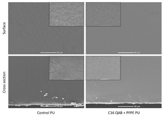 Scanning electron microscopy revealed homogeneous, smooth surface topography in both control and C16 QAB + PFPU polyurethanes (Figure 1). Uniformly distributed, submicron pores and channels were evident in the cross-sectional micrographs, with no difference in cross-sectional morphology between the polyurethanes. These micrographs indicate that the introduction of the antimicrobial and hydrophobic blocks in the polyurethane do not interfere with coating integrity and uniformity, an important parameter for end-use applications of the coatings.
