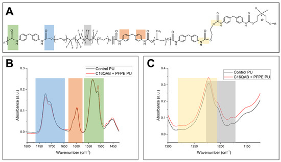 ATR-FTIR spectra of control PU and C16QAB + PFPE PU. (A) Chemical structure with characteristic bonds highlighted. (B) Urethane region with blue highlighting the ester stretch, orange highlighting cyclic alkyl stretch, and green highlighting CHN bend. (C) Yellow highlighting C-O and C-N stretching and fluorocarbon region with gray highlighting CF2 band. Spectra displayed were randomly chosen and additional replicate measurements are available upon request.