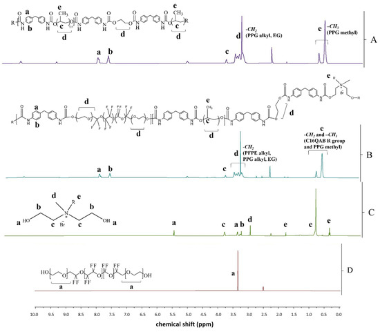 1H NMR spectra of synthesized control polyurethane (A), C16QAB + PFPE polyurethane (B), C16QAB (C), and PFPE (D). Spectra collected in DMSO-d6 (500 MHz). Lower case letters in chemical structures correspond to resonances (ppm) of the same lower case letter for each polyurethane variant.