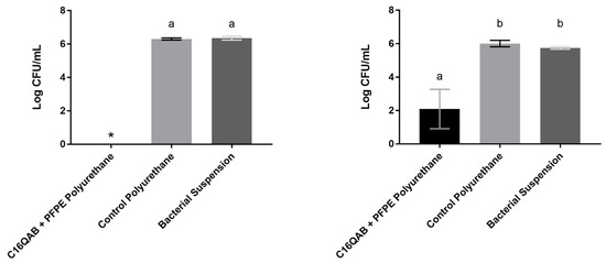 Antimicrobial efficacy of C16QAB + PFPE PU and unmodified PU was investigated against Listeria monocytogenes and Salmonella enterica by dynamic contact methods. Coatings were rinsed in 0.3 mM KH2PO4 at 37 °C while shaking until rinse buffer showed no bacterial inhibition (24 h). Unmodified polyurethane was used as a negative control and a bacterial suspension was used as an experimental control. Eight-hour contact time was chosen due to the shift structuring of food production facilities, with eight hours being a common food production shift followed by cleaning and sanitization. In the Listeria monocytogenes experiment, C16QAB + PFPE PU exhibited a log reduction below the limit of detection of the method used (3 CFU mL−1). Although buffer directly from the contact tubes was plated (1 × 100 CFU mL−1), no colonies were visible and therefore the bacterial concentration was less than 3 CFU mL−1. The starting concentration of bacterial suspension placed in the sterile tubes was calculated to be 5 log CFU mL−1 based on optical density at 600 nm, however, final concentration in experimentation was 6 log CFU mL−1. This discrepancy can be attributed to differences in bacterial growth based on plating and optical density of the preliminary bacterial growth curve. The bacterial suspension concentration for Listeria monocytogenes was 6.35 ± 0.13 log CFU mL−1 while the bacterial concentration in the polyurethane control tubes was 6.30 ± 0.06 log CFU mL−1 (Figure 4) after 8 h. For Salmonella enterica, the bacterial suspension concentration in C16QAB + PFPE PU tubes was 2.68 ± 0.18 log CFU mL−1 and the bacterial suspension concentration in the polyurethane control tubes was 6.05 ± 0.25 log CFU mL−1. Unmodified polyurethane for both experiments was not significantly different than the bacterial suspensions and therefore imparted no antimicrobial activity. The resulting efficacy of C16QAB + PFPE PU can be reported as >6 log or >99.9999% reduction of Listeria monocytogenes and >3 log or >99.9% reduction of Salmonella enterica. The difference in antibacterial efficacy between Gram-positive Listeria monocytogenes and Gram-negative Salmonella enterica can be attributed to the differences in cellular structure with Gram-negative bacteria possessing an outer lipid membrane. With the lack of outer lipid membrane, Listeria monocytogenes is more susceptible to the long alkyl chains as displayed in the >6 log reduction. Even with the differences in log reduction between Gram-negative and Gram-positive bacteria, the coatings produced herein have provided greater log reduction compared to previously reported functional polyurethanes with quaternary ammonium compounds. Wang et al. synthesized quaternary ammonium bromide functionalized polyurethanes which displayed antibacterial capability between 70.4% and 89.7% against Escherichia coli, Bacillus subtilis, and Staphylococcus aureus after four hours of contact [16]. Bakhshi et al. synthesized soybean oil-based polyurethanes with quaternary ammonium iodide functionality and reported 83–95% bacterial reduction against Escherichia coli and Staphylococcus aureus after overnight contact [14]. Direct comparison to other published work is difficult due to differences in methodologies used to determine antimicrobial efficacy; indeed, the wide range of conditions in antimicrobial materials assessments presents a significant and common challenge. Hu et al. used an interesting approach to determine antimicrobial efficacy of their polyurethane adhesives. In addition to the traditional antimicrobial efficacy test (i.e., Kirby–Bauer test), a susceptibility test was performed although the results do not translate to a log reduction value to draw comparisons [15]. Many other researchers utilize the zone of inhibition or Kirby–Bauer test to determine antimicrobial efficacy, however these test methods are not conducive to comparisons of antimicrobial activity (measured in log reduction). With over 6 log reduction of pathogenic Listeria monocytogenes, the antimicrobial coatings prepared in this research offer great potential for surface functionalized polyurethane coatings using quaternary ammonium compounds. Future work to explore alternative halogens, such as chlorine, in this polyurethane system could provide interesting information about bacterial susceptibility and coating functionality.