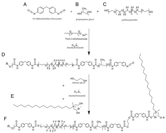 Two-step prepolymer reaction of MDI (A), PPG (B), and PFPE (C) forming the prepolymer (D). Chain extender and antimicrobial quaternary ammonium bromide (C16QAB) (E) added to form the final polymer C16QAB + PFPE polyurethane (F).