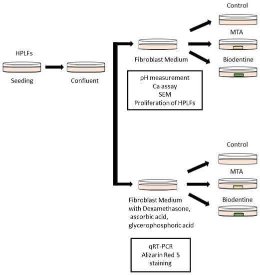 MTA and Biodentine were obtained from dental material handling manufacturers. All cements were mixed according to the manufacturer’s guidelines under aseptic conditions and were molded into 7 mm diameter and 1 mm thickness disks. The sample size was estimated based on data from previous studies of similar design [,]. All disks were placed in a 100% humidity incubator at 37 °C for 24 h, then were immersed in 70% ethanol and sterilized with UV light for 30 min at room temperature. All disks were placed in the center of each well in 6-well plates.