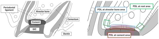 Experimental design of the in vivo study. (A) The pulp chamber floor was perforated toward the PDL without injuring the alveolar bone using a 0.5 mm round burr. The perforations were filled with one of the cements. After the initial setting time, all coronal access cavities were restored with GIC. (B) Three observation areas. PDL at the cement areas; PDL at the furcation area attached to the cement; PDL at the root areas; PDL at the coronal side of the tooth root (100 µm × 100 µm). PDL at the alveolar bone area; PDL at furcation area attached to the alveolar bone ridge.