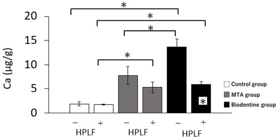 Mean values of calcium ion release from the control, MTA and Biodentine groups over 3 days. The + at the bottom of the graph indicates the presence of HPLFs and the −—indicates the absence of HPLFs. Asterisks in the bars indicate significant differences between the materials (* p < 0.05).
