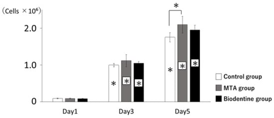 HPLFs exposed to MTA or Biodentine showed proliferation rates that were statistically similar to the control (Figure 5). A significant increase in proliferation was observed in the MTA group compared to the control group at day 5.