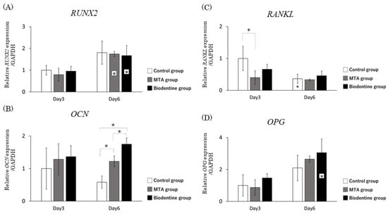 The mRNA expression level of RUNX2 was significantly higher in the MTA and Biodentine groups at day 6 compared to the MTA and Biodentine groups at day 3 (Figure 6A). Although over a period of 3 days, there was an increase in the expression of OCN mRNA in the MTA and Biodentine groups, this higher level was statistically significant only at day 6. Furthermore, the mRNA expression level of OCN in the Biodentine group was significantly higher than in the MTA group at day 6 (Figure 6B). The mRNA expression level of RANKL was significantly lower in the MTA group at day 3 compared to the control group. However, the mRNA expression level of RANKL at day 6 was not significantly different among the three groups at day 6 (Figure 6C). The mRNA expression level of OPG was significantly higher in the Biodentine group at day 6 compared to the Biodentine group at day 3. The mRNA expression level of OPG at days 3 and 6 was not significantly different among the three groups (Figure 6D).