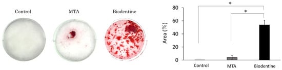 After 24 days of HPLF culture on the different materials in osteogenic medium, the MTA and Biodentine groups had increased amounts of calcium deposits (Figure 7A). In particular, the Biodentine group produced significantly more calcified deposits than the control group and the MTA group (Figure 7B).