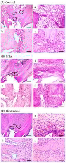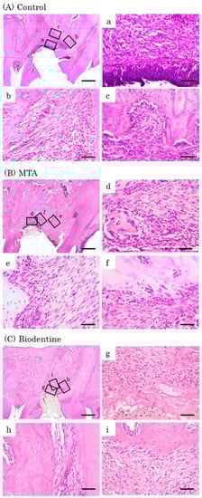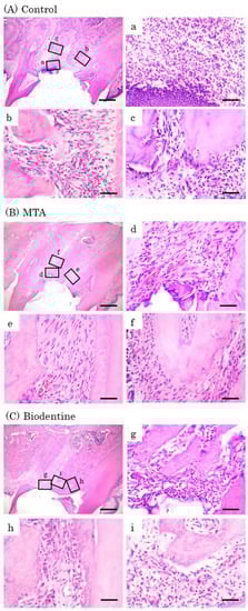 Representative features in the in vivo study using HE staining after surgery at day 28. Light micrographs of sagittal sections of maxilla showing the first molars of the control (A), the MTA (B) and the Biodentine (C) groups. (A) An epithelial layer, a small number of inflammatory cells (a–c) and osteoblasts (b,c). (B,C) A few inflammatory cells (d,g), and a line of osteoblasts were observed (e,f,h,i). Scale bars: 500 μm; (a–i): 50 μm.