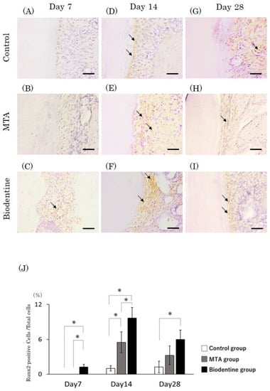 Immunohistochemical staining of Runx2. Light micrographs of sagittal sections of the PDL at root areas of the control (A,D,G), the MTA (B,E,H) and the Biodentine (C,F,I) groups at day 7 (A–C), at day 14 (D–F) and at day 28 (G–I). (J) Graph showing the number of Runx2-positive cells in the PDL at root areas from the control, MTA and Biodentine groups at days 7, 14 and 28. (* p < 0.05) Arrows; Runx2-positive cells. Scale bars: 50 μm (Arrows; Runx2-positive cells. Scale bars: 50 μm).