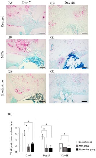 Light micrographs of sagittal sections of the PDL at alveolar bone areas of the control (A,D), the MTA (B,E) and the Biodentine (C,F) groups at day 7 (A–C) and at day 28 (D–F). (G) Graph showing the number of TRAP-positive cells in the PDL at alveolar bone areas from the control, MTA and Biodentine groups at days 7, 14 and 28. Asterisks in the bars indicate significant differences between the same materials compared to day 7. (* p < 0.05) Scale bars: 200 μm.