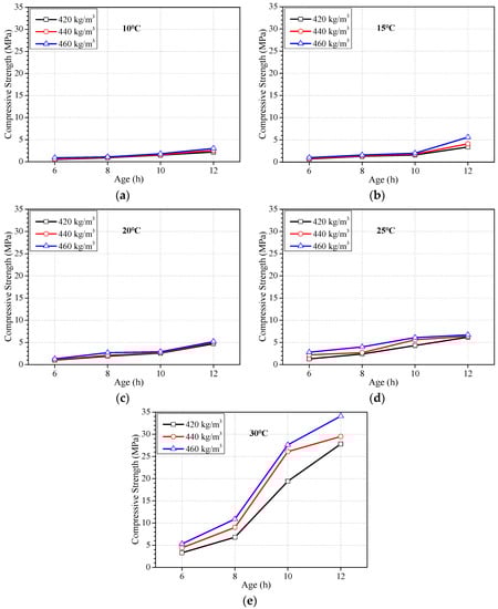 It can be seen from Figure 2 that the strength development does not exhibit an evident increase with increasing cement content when the ambient temperature is less than 25 °C. When the temperature is above 25 °C, the effect of cement content on the strength development starts to be evident. However, it is not effective to promote the strength at 6~12 h by increasing cement content. Although the strength increases significantly with the increase in cement content when the ambient temperature is 30 °C, the strength of concrete with 420 kg/m3 is relatively too high. Compared with the strength development in Figure 1, the ambient temperature is a crucial factor, or it is not necessary to adopt measures promoting strength when the ambient temperature is high enough, such as higher than 30 °C in this work. In a word, the effect of increasing cement content on promoting the earlier strength of concrete is very limited.