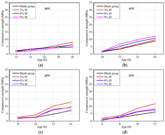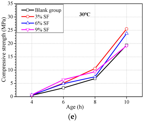 It can be seen from Figure 3 that the SF, to some extent, can promote the strength of concrete except the ambient temperature is 10 °C. However, the effect of SF on the strength enhancement varies with the content of SF, the ambient temperature, and age. When the temperature is at 20 °C or above, SF of 3% instead of 9% can achieve the highest enhancement of early strength at ages of less than 16 h. The extent of strength promotion increases with age. It is suggested that SF can be used to promote the earlier strength of concrete as long as the ambient temperature is above 15 °C, and there is a suitable content of SF for promoting the earlier strength of concrete at an age of less than 20 h.