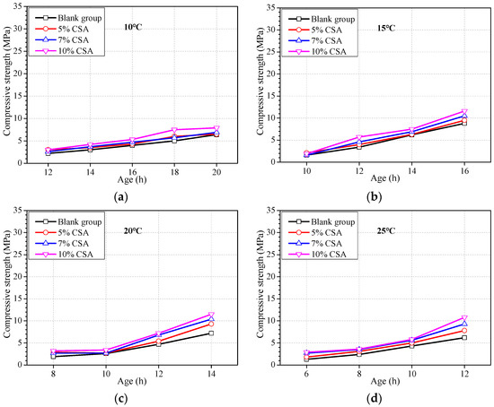 Concrete made from CSA can obtain higher early strength even in low ambient temperatures [52,53]. Previous works have confirmed the positive effect of the addition of CSA in OPC on early strength development [54,55]. However, the effect of the addition of CSA in OPC concrete on the concrete strength at a much earlier age and relatively lower ambient temperature is not clear. Figure 4 shows the strength development of concrete with 5%, 7%, and 10% CSA, replacing the same quantity of OPC, at ages of less than 20 h and at ambient temperatures of 10 °C, 15 °C, 20 °C, 25 °C, and 30 °C.