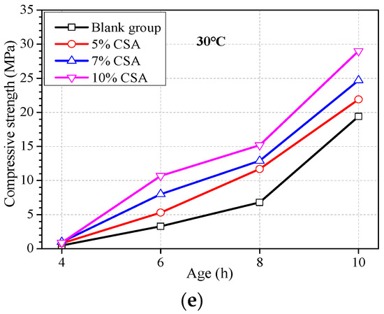 It can be seen from Figure 4 that CSA has a certain effect on promoting earlier strength within 1 d regardless of ambient temperatures, but no significant effect until the temperature is above 25 °C. It can be concluded that the addition of CSA in OPC concrete can be used as a way to promote earlier strength only to a certain extent. At the ambient temperature of 30 °C, the strength promotion at an age of 6 h increased more than doubled with CSA of 7%. It indicates that the addition of CSA is an effective way to promote earlier strength when the ambient temperature is relatively high.