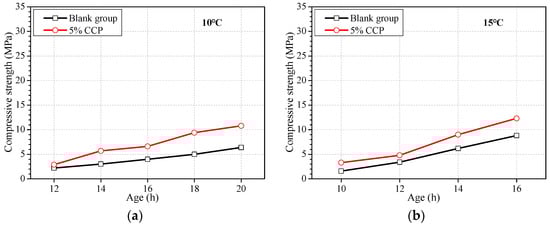 Figure 5 shows the effect of an early strength agent on the earlier strength. The early strength agent CCP is a kind of crystal seed containing C-S-H [47]. It can be seen from Figure 5 that the agent CCP can promote significantly the earlier strength of concrete at ages of less than 1 d even if at the ambient temperature of 10 °C. The agent CCP of 5% increases the strength by 65% at the age of 16 h, and by 69% at the age of 20 h when the ambient temperature is 10 °C. Similarly, the agent CCP is more effective in promoting the earlier strength of concrete at ages of less than 20 h when the ambient temperature is more than 15 °C.