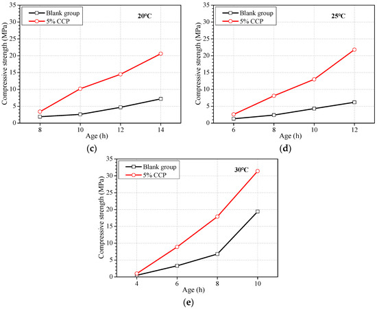 Strength development of concrete with addition of CCP at different ambient temperatures. Ambient temperature at (a) 10 °C, (b) 15 °C, (c) 20 °C, (d) 25 °C, and (e) 30 °C.