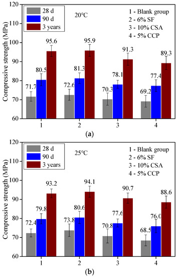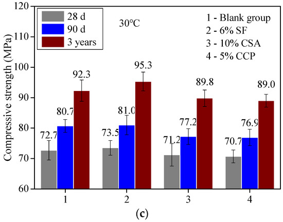 Figure 8 shows the strength of concrete with 6% SF, 10% CSA, and 5% CCP at ages of 28 d, 90 d, and 3 years, at temperatures of 20 °C, 25 °C, and 30 °C, respectively.