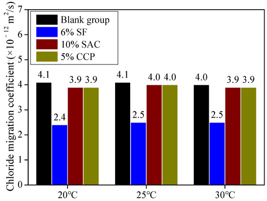 The resistance to chloride ion permeability can reflect the compactness of concrete and is a commonly used method to characterize its durability [56]. Figure 9 shows the effect of measures for promoting concrete strength at an earlier age on the chloride migration coefficient. It can be seen from Figure 9 that the addition of SF can significantly reduce the chloride migration coefficient, and other measures do not have an evident impact on the coefficient. It is concluded that all measures above have no negative influence and even a certain positive effect on the durability of concrete while promoting the strength of concrete at an earlier age.