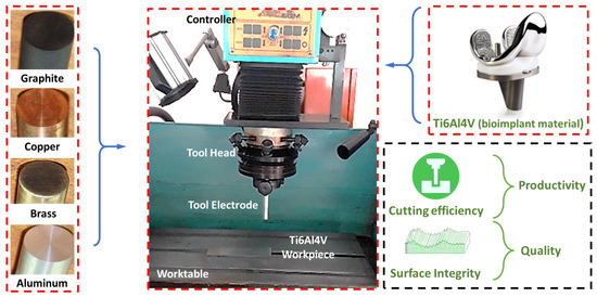 - Farooq, M.U.; Bhatti, H.A.; Asad, M.; Kumar, M.S.; Zahoor, S.; Khan, A.M. Surface Generation on Titanium Alloy through Powder-Mixed Electric Discharge Machining with the Focus on Bioimplant Applications. Int. J. Adv. Manuf. Technol. 2022, 122, 1395–1411. [Google Scholar] [CrossRef]