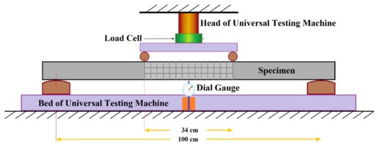Figure 1 illustrates the third-point loading test employed in this study, which was conducted following the specifications outlined in ASTM C78/C78M-22 []. However, it is important to note that, as the primary focus of this research centers around concrete slabs rather than the beams referenced in the ASTM standard, test specimens with a total length of 120 cm and a height of 7 cm were utilized. The lower support span was set at 100 cm, with the middle one-third span measuring 34 cm. Furthermore, the study involved subjecting the specimens to cyclic third-point loading under various loads, as depicted in Figure 1.