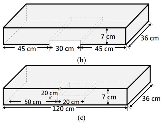 This study involved the fabrication of three distinct types of unidirectional reinforced concrete slabs, which were subsequently further categorized. Each unidirectional reinforced concrete slab had dimensions of 120 cm × 36 cm × 7 cm, as shown in Figure 2. The three types of concrete slabs employed in this study were as follows: (1) reinforced concrete (RC) slab without any repair (referred to as B), as seen in Figure 2a; (2) RC slab featuring a 30 cm × 36 cm × 2 cm rectangular groove on the tensile side (referred to as R), as seen in Figure 2b; and (3) RC slab with a 20 cm × 20 cm × 2 cm square groove on the tensile side (referred to as S), as seen in Figure 2c.