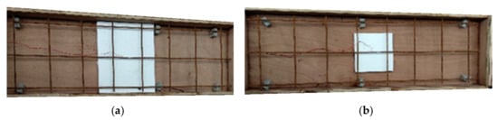 To replicate deteriorated concrete slabs, a previous study employed concrete slabs with deliberately introduced notches []. By incorporating various opening notches into the test specimens, the simulation aimed to represent the retrofitting process of an old building with a new elevator shaft. Reinforcing the opening area using carbon fiber sheets resulted in flexural strengths surpassing those achieved through traditional reinforcement methods [,,,,,,].
