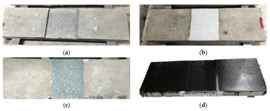 Rectangular-grooved specimens after repair and reinforcement: (a) specimen R; (b) specimen R-E; (c) specimen R-G; (d) specimen R-G-C and specimen R-E-C.