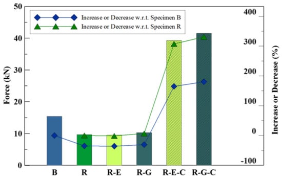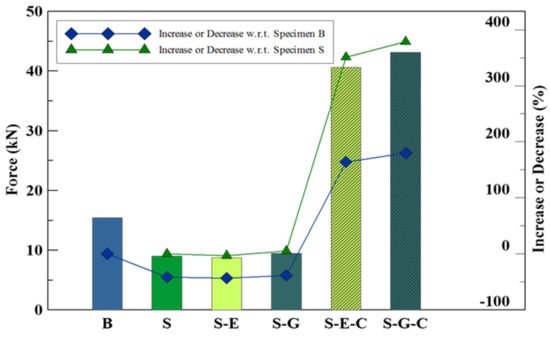 Table 8 shows the results for the ultimate load, displacement, and respective average values of the benchmark specimens and the specimens with square grooves.