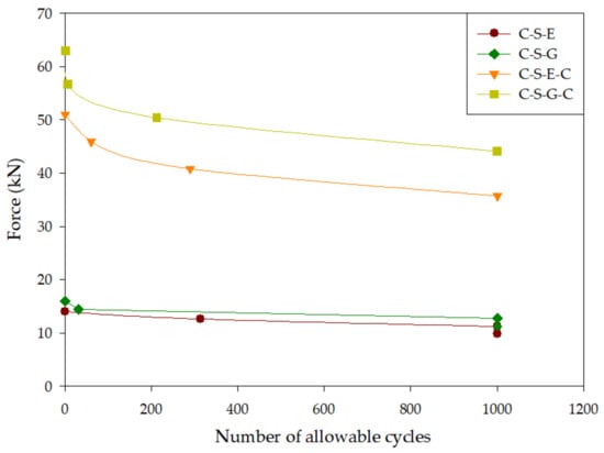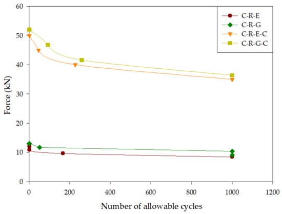 Figure 9 depicts the correlation between the number of load cycles-to-failure and the rectangular-grooved specimens in the cyclic third-point loading test. For instance, let us consider specimen C-R-G-C, which exhibited an ultimate load of 52 kN. At 0.9 times the ultimate load, the load amounted to 46.8 kN, while at 0.8 times and 0.7 times the ultimate load, the loads were 41.6 kN and 36.4 kN, respectively.