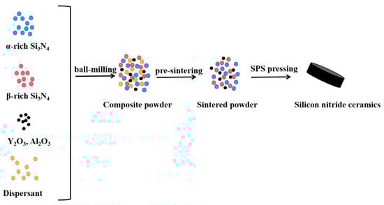A mixture comprising 20 g of 1# and 2# Si3N4 was introduced into a beaker as indicated in Table 1. Subsequently, 360 μL of a solution containing PEG 400, ammonium citrate (dispersant), and 600 μL of PAA (adhesive) were added. To facilitate the sintering process, a total of 1.4 g of Y2O3 and 0.6 g of Al2O3 were introduced. The solution’s pH of 9.8 was modified and subsequently introduced into a polyurethane ball milling tank, containing zirconia grinding balls in a ball-to-powder weight ratio of 3:1. The wet-mixing process was carried out using pure water as the medium, and ball milling for 24 h. The compositions of various samples are provided in Table 1. Following ball milling, the slurry underwent vacuum drying at 120 °C for 24 h. After that, an 80-mesh sieve was utilized to obtain the Si3N4 composite precursor. The precursor was then subjected to pre-sintering at 800 °C for 2 h in a tube furnace, under an atmosphere of N2 (OTF- 1200X, Hefei Kejing Materials Co., Ltd., China). After pre-sintering, the product was again sieved through an 80-mesh sieve to acquire Si3N4 composite particles. Finally, the as-prepared Si3N4 composite was inserted into a graphite mold and subjected to Spark Plasma Sintering (SPS) at 1650 °C for 30 min while being subjected to a pressure of 30 MPa (SPS-5T-5-III, Shanghai Huachen Technology Co., Ltd., Shanghai, China). As shown in Figure 1.