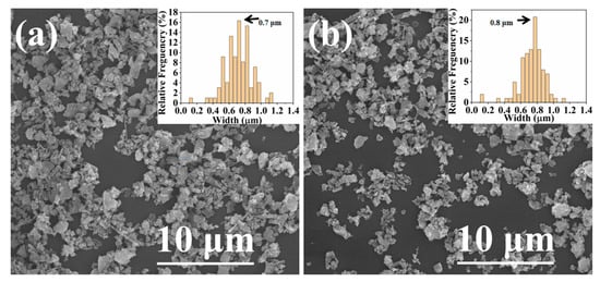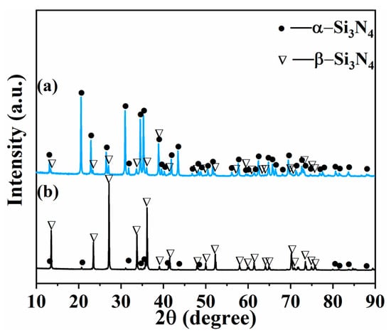 Figure 3 shows SEM images of raw powder samples of α-rich Si3N4 and β-rich Si3N4. Raw powder samples of α-rich Si3N4 comprised irregularly shaped particles that were observed to aggregate (size = 0.5–1 μm), as shown in Figure 3a. Combined with the analysis of XRD patterns (Figure 2), it can be concluded that the observed rod-like powder was β-Si3N4. Raw powder samples of β-rich Si3N4 also comprised irregularly shaped particles with aggregation (size = 0.5–1 μm), as shown in Figure 3b. Overall, the two powders had consistent shapes and sizes, and the particles were found to be well dispersed with negligible agglomeration.