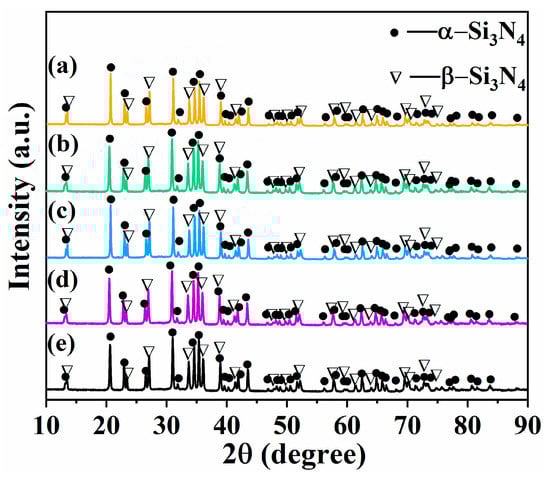 XRD patterns of Si3N4 samples prepared by SPS at 1100 °C: (a) SN0; (b) SN1; (c) SN2; (d) SN3; (e) SN4.