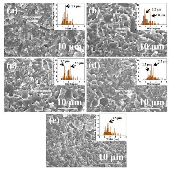 SEM images of sample fractures prepared by SPS at 1100 °C: (a) SN0; (b) SN1; (c) SN2; (d) SN3; (e) SN4. Insets show the size distributions of grains.