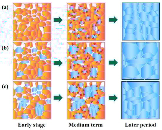 Representative figure of sintering mechanism of silicon nitride ceramics: (a) 0% of β-Si3N4 seed crystal; (b) 20% of β-Si3N4 seed crystal; (c) 50% of β-Si3N4 seed crystal. (“early stage” refers to the original powder before sintering; “medium term” refers to the microstructure change of silicon nitride ceramics sintered at 1100 °C; “later period” refers to the microstructure change of silicon nitride ceramics sintered at 1650 °C).