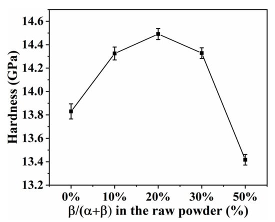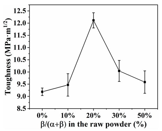 Since the microstructure of Si3N4 ceramics is generally complex and uncontrolled, the effects of the phase composition of raw materials on the performances of Si3N4 have been thoroughly investigated [,]. Becher et al. [] prepared Si3N4 ceramics with high fracture toughness (~10 MPa·m1/2) by sintering at 1850 °C under 1 MPa N2 atmosphere for 6 h, with α-Si3N4 and 2 vol% β-Si3N4 as raw materials. In order to ascertain the effects of β-Si3N4 seed crystal on the performances of Si3N4 ceramics, Peillon et al. [] prepared Si3N4 ceramics with 2 vol% and 5 vol% of β-Si3N4 seed crystal and found that Si3N4 ceramics with 5 vol% of β-Si3N4 exhibited improved fracture toughness (8.4 MPa·m1/2). In their study, the fracture toughness increased by 30% as the sintering time increased by 3 h. Lee et al. [] reported the synthesis of nanoscale α-Si3N4 with grain size distributions with two peaks when sintering was performed with the inclusion of β-Si3N4 (0%, 50%, 100%). The addition of β-Si3N4 led to improved performance of Si3N4 ceramics, where the sample with 50% of β-Si3N4 seed crystal exhibited the highest fracture toughness (7.9 MPa·m1/2). However, there is a need to further investigate the optimization of the β-Si3N4 seed crystal content since the high costs of nanoscale β-Si3N4 are not suitable for industrial applications.