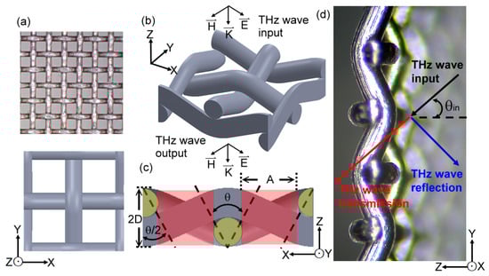 The THz plasmonic metamaterial, based on MWW-HAs, is presented in Figure 1, including the mechanical drawings and photographs. Figure 1a illustrates the top-view configuration that indicates the square and periodic hole array in the X–Y plane, with a pore width of A and a metal-wire width of D. The three-dimensional and side-view configurations of MWW-HA are shown in Figure 1b,c, respectively, presenting the mechanical structure of a woven metal wire. The bending angle θ of a woven metal wire critically performs on the bases of the pore width (A) and structural thickness (2 × D) parameters as schematically illustrated in the side-view drawing of the X–Z plane. The three-dimensional view of the mechanical drawing in Figure 1b shows two pairs of metal wires weaving an MWW-HA unit. A pair of woven metal wires along the X or Y axis is oppositely bent toward the +Z and –Z directions. Thus, the X and Y-axial pairs of woven metal wires construct four square holes within an MWW-HA unit, whose space is marked with red in the side view configuration [Figure 1c]. The photograph of Figure 1d presents the side-viewed MWW-HA, which is woven by stainless steel metal wires in this study. The corresponding A, D, and θ used in this paper are listed in Table 1. Those MWW-HAs with structural numbers from 1 to 6 (Table 1) are normal and available from hardware stores without any fabrication process. To characterize the MWW-HAs in THz spectroscopy, the THz waves are normally input on MWW-HAs [Figure 1d, θin = 0°].