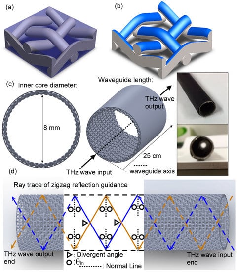 Terahertz (THz) waves, in the frequency range of 0.1–2 THz, exactly cover the millimeter and sub-millimeter electromagnetic (EM) waves that act as radiation in the new generation of wireless communication [1,2]. The investigation of the THz transceiver becomes critical because the short broadcast distance of THz radiation resembles that of free space optics, which is in contrast to that of microwave radiation [3,4]. Signal transportation among THz transceivers can improve the low diffraction efficiency of THz communication in a complex space, which is composed of many sharp shadows of building walls, people, and certain obstacles to block THz EM signals [1]. Efficiently controlling or manipulating the amplitude or phase of THz radiation through solid-state media is, thus, critical for achieving the signal connection through THz transceivers. Hollow core pipe waveguides, with inner reflection configurations of single plastic sheets [5], metal-coated surfaces [6], and various microstructural [7,8,9] rings, have distinct advantages when performing as wireless telecom transceivers, including a large acceptance angle to receive THz emission, low waveguide loss, uniform modal field, and flexibly directional operation.