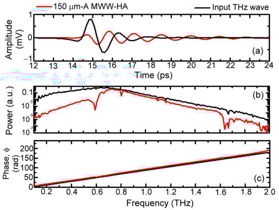 (a) THz time–domain waveforms measured in THz-TDS, as well as the relating (b) power transmission and (c) phase spectra.