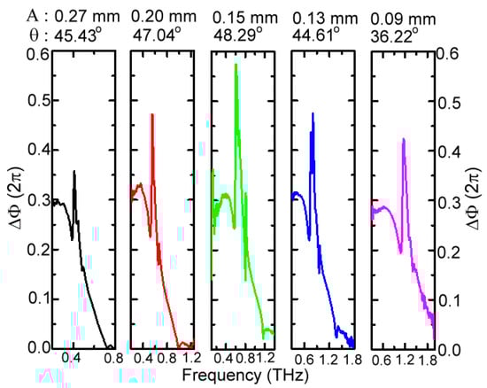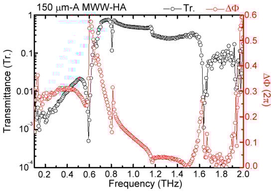 Based on the three-dimensional schematic diagram of Figure 1b for measuring a transmission spectrum of MWW-HA plasmonic metamaterial, the THz waveforms of electric field oscillation in the time domain, illuminated on and output from one example of a 150 μm-A MWW-HA, are shown in Figure 3a. Figure 3a shows that the input THz pulse waveform out of the 150 μm-A MWW-HA is obviously broadened to shrink the input wave bandwidth, corresponding to filter out a certain spectral range of THz waves without transmission. Based on the Fourier–transform function of the MATLAB program, the corresponding power and phase spectra, individually shown in Figure 3b,c, were obtained. As THz frequency increases, the phase–spectral curve in Figure 3c is straightforwardly extended without winding, to constrain the maximum phase value of less than 2π radian, but it does not hinder the evaluation of measured ∆ϕ that was obtained from the propagation phase difference between the input and output MWW-HA THz waves. THz wave power loss is obvious for the transmitted power spectrum after passing this MWW-HA, and several sharp dips also occur. Based on Equations (1) and (2), transmittance (Tr.) and phase delay (or retardation, ∆ϕ) spectra of 150 μm-A MWW-HAs are, respectively, shown in Figure 4. The Tr. curve, denoted by a black circle line, has a high-frequency pass character with distinct spectral dips at 0.59, 0.805, 1.17, and 1.63 THz, which can be evaluated from the theory in Equation (4) for the MWW-HA TE mode. The spectral dip at 1.93 THz comes from the measurement deviation of the spectral edge, which is not reliable to be discussed in this study. The rejection band to reflect THz waves has a frequency of 0.1–0.59 THz. THz waves with high transmittance are in the frequency range of 0.59–1.63 THz, which becomes lower as the frequency is higher than 1.63 THz. For using the MWW-HA pipe wall material, the low-frequency-rejection waves (0.1–0.59 THz) can perform zigzag reflection transmission inside the hollow-core pipe. The ∆ϕ curve, denoted as a red circle line, shows spectral peaks around those Tr.-curve dips. For the transmitted bands in the frequency range of 0.59–1.48 THz, the trend of ∆ϕ curve performs an abnormal dispersion property. The average ∆ϕ value becomes the lowest value, corresponding to a low dispersion property, as THz wave frequency increases to 1.63–1.93 THz. These two dispersion properties, which were aforementioned, individually, at 0.59–1.63 THz and 1.63–1.93 THz, indicate the evanescent field transmission of MWW-HA emerging at the output end surface.