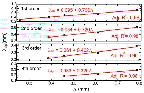 For various MWW-HAs, as shown in Table 1, their four spectral dips of Tr.-curves were further measured and correlated with corrugated periods (Λ) of woven metal wires in Figure 5. The spectral dips of MWW-HA at different frequencies resemble the wavelength or frequency-dependent power depletion of transverse resonance on the woven metal wires. Spectral dips within 0.1–2 THz have four orders, and the first spectral dip has the longest wavelength or the lowest frequency among the four orders of power depletion. The fitting curves between the spectral dip wavelength (λdip) and MWW-HA period (Λ) were then obtained to study their power depletion mechanism on an MWW-HA surface. However, such a power depletion of spectral dips does not follow the resonance principle within a one-dimensional cavity of the corrugated woven metal wire. As shown in the evaluated slope of a fitting curve, λdip/Λ, in Figure 5, the cavity width, Λ, is not related to the integer multiples of a half wavelength because the measured spectral dips do not follow the resonance principle that is controlled by the longitudinal wave phase, i.e., the part of Equation (4) [14], where the propagation constant makes , and . The slopes of the first to the fourth spectral dips, with increasing THz wave frequency from 0.1 to 2 THz, are 0.796, 0.720, 0.402, and 0.320 for those MWW-HAs in Table 1. The side-view drawing in Figure 1c illustrates that one corrugated woven metal wire at the MWW-HA surface has one triangle-shaped cavity, but not a rectangular one, with a Λ base length (2A + 2D) to interrupt THz wave transmission. For the interrupted THz waves, the air space width to stay in the X axis is not uniformly equal to the Λ value while propagating along the Z axis. The power depletion of THz waves thus occurs for the Z axial propagation, which is interrupted on the metal woven wire surface and in the X-axial electric field (E-field) direction. Contrarily, those metal woven wire surfaces, perpendicular to the E-field (i.e., the Y axis), can pass the THz wave without any frequency-dependent power rejection or depletion of metal. From the transmission principle of metal holes in Equation (3), the TE mode of THz wave propagation, with those woven metal woven wires along the X-axial E-field, can deplete power owing to their corrugated shapes (i.e., a triangle-shaped cavity in the X-Z plane). As presented in Equation (4), the THz wave amplitude of TE mode transmission is modulated from the wave function of , owing to the corrugated metal woven wires in the E-field direction. The strength of the power depletion of MWW-HA, performing on the transmittance of spectral dips, is correlated with this amplitude wave function——in theory [Equation (4)]. The four spectral dips in the experiment of Figure 5 also do not follow the regular diffraction orders of periodic metal holes or slits, and thus, we define the measured spectral dips of MWW-HA as the power depletion orders. As wave frequency increases from 0.1 to 2 THz, the first to fourth power depletion orders are respectively defined for the first to fourth spectral dips, as indicated in Figure 4 and Figure 5.