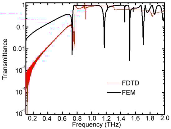 For 150 μm-A MWW-HA, the distinct power depletion feature of transmission spectral dips in Figure 4 can also be found in the simulation of the finite-difference time–domain (FDTD) method in Figure 6, which was supported from the graphic and numeric functions of MATLAB programs. However, based on the reasonably chosen settings of a boundary condition, the finite element method (FEM) cannot predict these spectral dips well with those measured in the high-frequency-passed range [17]. The FEM method was also supported from the graphic and numeric functions of MATLAB programs. Figure 6 illustrates that the FEM simulation of the transmission spectrum at the high-frequency-passed range results in many noisy dips that are not observed in experiments (Figure 4), and they cannot be summarized with significant trends while tuning MWW-HA parameters (Table 1). The transmittance decay of around 1.8 THz, due to the increased resistance of resonant transmission, as shown at the measured result of Figure 4, is also found from the FDTD simulation (i.e., the red curve in Figure 6), not the FEM one. The increased resistance of resonant transmission basically comes from the middle woven metal wire in the unit cell structure [14]. FEM only simulates one structural unit of 150 μm-A MWW-HA, based on the Floquet analysis, to solve the integral formulation of Maxwell’s equations [17]. However, FDTD simulates the large structure reacting with the specified THz wave energy range in the experiment. That is, comparing the results between FEM and FDTD simulation methods, as shown in Figure 6, presents that the used MWW-HA structure should cover the transverse beam spot range of input THz waves, not only one-unit cells [Figure 1b,c and Figure 2a,b].