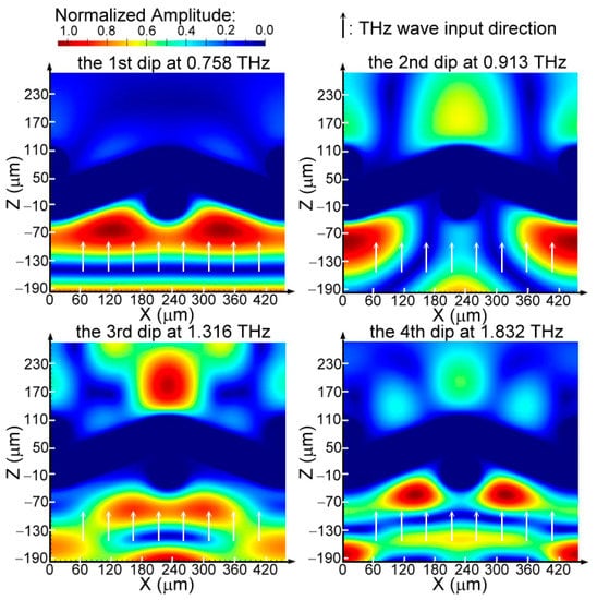 Among the measured transmission spectral dips in Figure 4, the third order of power depletion at 1.17 THz is the lowest, which is also found in the calculation of the FDTD simulation (i.e., the red curve in Figure 6). Based on the amplitude modulation part of X-axial woven metal wires, [Equation (4)], and the measured slope of λdip-Λ relation in Figure 5 (0.796, 0.720, 0.402, and 0.320), the responding amplitudes of 150 μm-A MWW-HA to transmit THz waves are approximately , , , and . The 150 μm-A MWW-HA transmitted wave at the third order of power depletion has the highest absolute amplitude value, 0.81634 [i.e., ], and therefore the spectral dip is especially unclear. Such consistence of spectral-dip visibility between the measurement (Figure 4) and the FDTD simulation (Figure 6) is also found in the strong power depletion at the other three spectral dips in 0.1–2 THz (i.e., the first, second, and fourth power depletion orders). Furthermore, the curve feature of high-frequency-passed and plasmonic reflection spectra, aside from one cut-off plasmonic frequency, is presented by the FDTD simulation (Figure 6), which is also consistent to that of the measured result in Figure 4 and the Equation (5) definition. Consequently, the normalized amplitude of E-field distribution on the X–Z plane of the Y-axial center (Figure 1) is further calculated by the FDTD method for the 150 μm-A MWW-HA, which is illustrated in Figure 7. The third spectral dip in Figure 7 has the strongest E-field at the output end face, which is compared among the E-field distributions of the four spectral dips in the X–Z plane. At the input end (z = −70–−10 μm, Figure 7), E-field cumulates on the woven metal wire of the 150 μm-A MWW-HA unit. As the THz frequency of a spectral dip increases from the first to the fourth order dips of power depletion, the slope value of λdip/Λ reduces (Figure 5) to move those field cumulations of metal surface waves at z = −70–−10 μm for approaching the middle-woven metal wire section, which locates approximately 240 μm of the X axis (Figure 7).