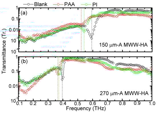 Figure 8a,b, respectively, present the transmittance spectral variations of 150 μm and 270 μm-A MWW-HAs that were integrated by PI and PAA polymers. The high-frequency wave passing–transmittance curves for integrating PI and PAA dielectrics can be preserved to perform a redshift at the first spectral dip and cut-off frequencies of MWW-HA, which define the spectral range of low THz frequency for reflecting waves. The spectral shift range, compared with that of a blank MWW-HA, is proportional to the THz refractive index or wavenumber surrounding the corrugated space of woven metal wires [Equations (3)–(5)]. The X and Y-axial amplitudes of the MWW-HA TE wave function in Equation (4) change and are shown as , where neff indicates the effective refractive index of THz waves on MWW-HAs. The measured spectral ranges of redshift in Figure 8a,b show that the THz refractive index of PAA is higher than PI, owing to high molecular polarity. The thermal process of imidization only removes the water element, H2O, from a PAA molecule to become the PI molecule. The molecular polarity of H2O is high, making PAA molecules perturbed easily by THz waves compared to PI molecules. It also means the time-dependent electric field of THz waves in PAA is more delayed than in PI. Furthermore, the increased OPL condition weakens power depletion with increased transmittance at the first spectral dip of MWW-HA [Figure 8a,b]. Therefore, the E-field on the woven metal wire surface partially distributes inside and outside the PAA or PI dielectric [Figure 2a], consequently reducing the strength of power depletion from the woven metal wires. However, for the increased OPL, only the first-order dip of power depletion can be preserved, and the other high-order dips disappear with rising transmittance.