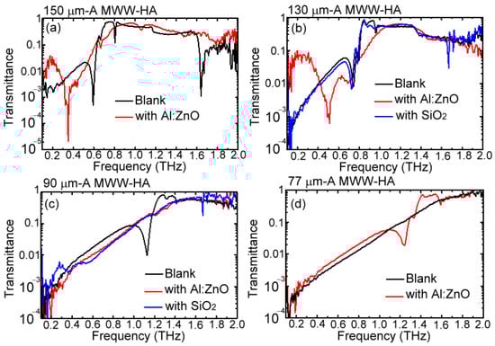 The blank 130 μm and 90 μm-A MWW-HAs were coated by a 500 nm-thick SiO2 film on one side surface of a blank MWW-HA; their measured transmittance spectra are also expressed in Figure 9b,c, and they are denoted by the blue spectral curves. For the AZO-coated woven metal wires, the conductivity largely reduces, and the measured frequencies of the first spectral dips redshift, as presented on the 150 μm and 130 μm-A MWW-HAs [the red spectral cures in Figure 9a,b]. However, for the approximate amplitude modulation between the first and fourth spectral dips of 150 μm-A MWW-HA [Figure 9a], the fourth spectral dip at 1.63 THz flattened without any spectral shift effect. Although the 160 nm-thick AZO and 500 nm-thick SiO2 have approximate OPL, considering their refractive indices in THz frequency and their physical thickness, their redshift at the first spectral dip is different, as shown in Figure 9b. Figure 9b expresses that the SiO2-coated surface almost cannot shift the first spectral dip of 130 μm-A MWW-HA, but a very large redshift occurs when the woven metal wires are coated with the AZO layer. However, the first-order dip of the 90 μm-A MWW-HA at 1.127 THz disappears, as shown in Figure 9c, while coated with AZO and SiO2 layers. Figure 9d shows that the 77 μm-A MWW-HA, originally, does not have any transmittance spectral dip in the 0.1–2 THz range, but the AZO-coated surface contrarily induces one transmittance spectral dip at 1.23 THz, which is the first-order dip for the MWW-HA power depletion.