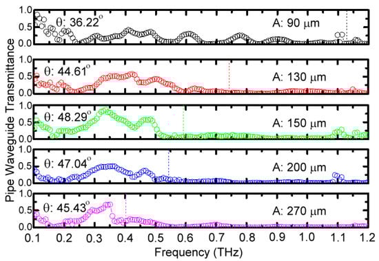 The ∆ϕ spectrum of 150 μm-A MWW-HA in Figure 4 is replotted in Figure 10 and compared with other MWW-HAs in Table 1 with 0.27, 0.20, 0.13, and 0.09 μm-A values. The 150 μm-A MWW-HA has the highest ∆ϕ response around the first spectral dip frequency, and the ∆ϕ value peak approximates to π and occurs in the frequency range of a metal hole reflection band. Such a π-∆ϕ response of the 150 μm-A MWW-HA indicates that the performance of specular reflection can be obtained based on the 48.29°-θ woven metal wires and MWW-HA structure (Figure 1 and Table 1). The π retardation of metal holes certainly cannot be achieved by the planar metal hole arrays that are perforated from one metal slab because of the zero longitudinal space in an optic axis to modify the THz wave propagation constant. For presenting this character of specular reflection guidance, based on the 150 μm-A MWW-HA, a hollow-core pipe configuration, as shown in Figure 2c, is used to control and reflect THz waves to guide straightforwardly in a 25 cm-long distance. Given that the large core of an 8 mm diameter is much larger than the wavelengths for 0.1–1 THz waves (0.3–3 mm), THz waves zigzag reflect from the MWW-HA pipe wall. Figure 11 shows the transmittance of hollow-core pipe waveguides based on various MWW-HAs, as shown in Table 1, as well as the configuration of Figure 2c, where the dotted lines indicate the measured THz frequencies of the first spectral dips, owing to the power depletion on the woven metal wires [Figure 5]. The measured and compared results of Figure 11 show that the 150 μm-A MWW-HA with the largest θ value, 48.29°, performs the highest transmittance of a 25 cm-long hollow-core pipe waveguide, and the corresponding transmittance spectral peak is up to 0.869 at 0.336 THz. As the θ parameter of metal woven wire reduces from 48.29° to 47.04° (200 μm-A MWW-HA) and 45.43° (270 μm-A MWW-HA), the corresponding transmittance peak of the hollow-core pipe reduces to 0.504 and 0.676 at 0.358 and 0.351 THz, respectively. Consistently, when further reducing the θ parameter of MWW-HA from 48.29° to 44.61°, the corresponding transmittance peak of the hollow-core pipe reduces to 0.574 and locates at 0.424 THz. Therefore, among these MWW-HA pipe wall materials (Table 1), the ∆ϕ spectral peak of π for the 150 μm-A MWW-HA (Figure 10) exactly realizes the highest reflectivity within its plasmonic reflection band [<0.65 THz, Figure 4 and Equation (5)] that approaches specular reflection inside the MWW-HA-pipe core [Figure 2c] because of its largest metal wire bending angle θ [Figure 1b]. This specular reflection of the 150 μm-A MWW-HA pipe wall eventually performs the highest transmittance, up to 0.869, for a 25 cm-long pipe length. The pipe-transmission spectral peak is located at 0.336 THz, but it is lower than the frequency of the first power depletion order, 0.59 THz (Figure 4), because of the increased OPL [Figure 8a and Figure 9a] of the zigzag reflection process [θin ≠ 0°, Figure 1d]. For the 90 μm-A MWW-HA material, a pipe waveguide transmittance peak of 0.862 is at the spectral edge, 0.1098 THz, owing to the smallest banding angle of woven metal wire (θ = 36.22°, Table 1). It effectively comes from the power reflection of a planner metal surface, not that of periodically corrugated metal wires (i.e., the woven metal wires of an MWW-HA structure). It normally occurs for the extremely low-frequency waves without correlating to the three-dimensional structure of MWW-HA, including the geometric factors of θ, A, and D. In the frequency range of 0.15–1.13 THz, those metal holes of 90 μm-A MWW-HA are too small to leak power from the pipe core based on the plasmonic reflection criterion at Equation (5), , but the corresponding 36.22°-θ value is too small to deviate the specular reflection (∆ϕ = π) performance at 48.29°-θ. When the pipe-guided THz wave frequency further reduces down to approximately 0.1 THz, the θ factor disappears without retardation on the THz wave phase. It means the corresponding wavelength is much larger than the cross-section of woven metal wires without Z-axial longitudinal interaction. Only the A factor contributes specular reflection within the 90 μm-A MWW-HA pipe for the transmittance spectral peak.