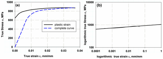 The Ti-27Nb alloy has the flow properties shown in Figure 1a and listed in Table 1. The mechanical properties were determined using a simple tensile test described in Ref. [29], and the hardening properties were determined using the logarithmic scale of the yield curve (Figure 1b). These types of alloys have attractive applications in human implants, where they exhibit good biocompatibility and high durability. The main component of the Ti-2Nb alloy is titanium (Ti) and niobium (Nb), with 26.01 ± 1.05 wt% each [29]. The durability of the implant is more dependent on the fatigue life; therefore, it is important to study the behaviour of such a bioactive alloy under fatigue.