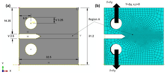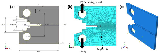 The finite element domain of the compact tensile specimen (CT) with linear model test is shown in Figure 2a; the dimensions are in accordance with ASTM E399 [41], and the specimen is loaded in tension until failure. The boundary conditions are explained according to the experimental data in Ref. [29]; the two loaded pins were loaded with a peak load PQ of 3030 N, and the initial value per crack was 1.3 mm. No DOF was allowed across the z-axis or x-axis, and one degree of freedom was allowed across the y-axis (see Figure 2b). XFEM was used to measure the J-integral around the crack tip, so no crack-enriched function was determined. The total number of elements was 40,000, with a hexagonal shape, and a linear brick with eight nodes. A reduced integration and hourglass control (C3D8R) was chosen. Region A is denser and finer than the other section of the sample. The convergence of the mesh was tested many times to select these types and the number of elements.