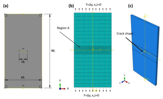 A nonlinear model with the same permeable characteristic was used for the central notch stress, and the area is the same as in Figure 3, with an initial central crack of 10 mm. The objective of using this specimen type is to study the effects of specimen types on crack growth rate. The boundary conditions were controlled strains, implementing one degree of freedom with a maximum displacement corresponding to the peak load in the y-direction, while the other directions were constrained.